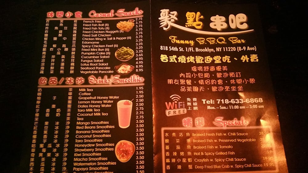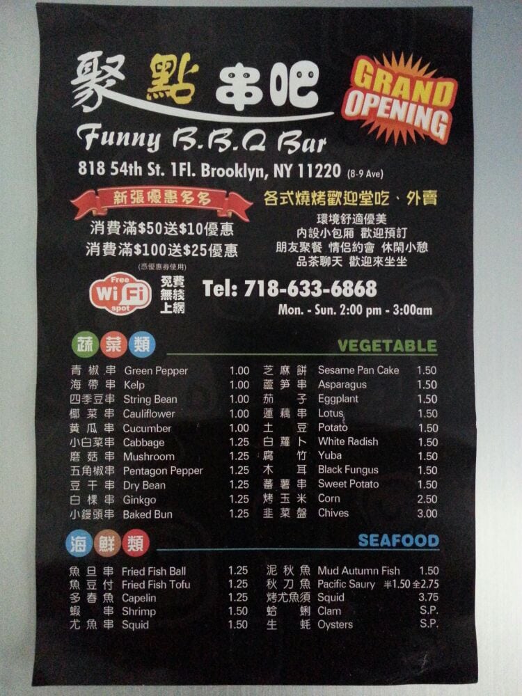 Welcome to Funny BBQ, where the sizzle of Chinese barbecue meets the warmth of Brooklyn's vibrant dining scene. Located at 818 54th St, this unclaimed gem is perfect for casual gatherings and family outings. With seating options available both indoors and outdoors, you can relish your meal in a lively atmosphere, complete with free Wi-Fi and a TV for entertainment.
